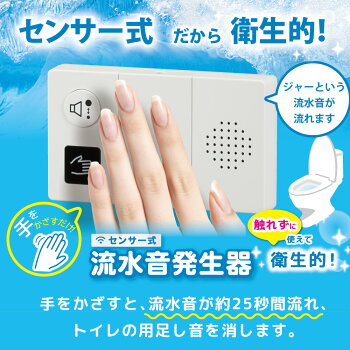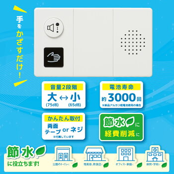 【 特 長 】 ● センサー式だから、触れずに使えて衛生的 ● 手をかざすと流水音が約25秒間流れます ● 設置の向きを上下左右自由に選べます ● 本体貼付用「ご使用方法シール」付き ● 音量は大(75db)/小(65db)2段階 ● 単3形乾電池2本で約3000回使用できます(新品アルカリ乾電池使用の場合) ● 付属の両面テープ/ネジ(電池ケース内に収納されています)でかんたんに取付できます 【 仕 様 】 ■ 外形寸法:(約)幅120×高さ70×奥行21mm ■ 質量:約70g(本体のみ) ■ 使用電池:単3形乾電池×2本(別売) ■ 電池寿命:約3000回 ※新品アルカリ乾電池使用の場合 ■ センサー:約5cm(手をかざす場合のセンサー検知距離) ■ 動作時間:約25秒(流水音が流れます) ■ 音量:約75dB (音量大)/約65dB(音量小)※距離1mの場合 ■ 動作温度:0℃〜40℃ ■ 付属品:保証書付取扱説明書、両面テープ×2枚・固定用ネジ×2本(電池ケース内に収納されています)、本体貼り付け用シール×1枚