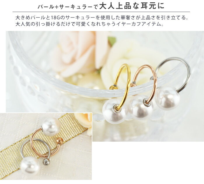 ◆オススメポイント◆ 大人気!引っ掛けるだけで可愛くなれちゃう イヤーカフアイテム! 大きめパールと18Gのサーキュラーを使用した華奢さが 上品さを引き立て、大人上品な耳元に。