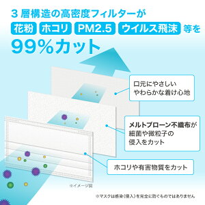 耳が痛くなりにくい柔らか素材を使用! 3層の不織布構造でウィルス飛沫、ほこり、花粉等のミクロ粒子をシャットアウト。