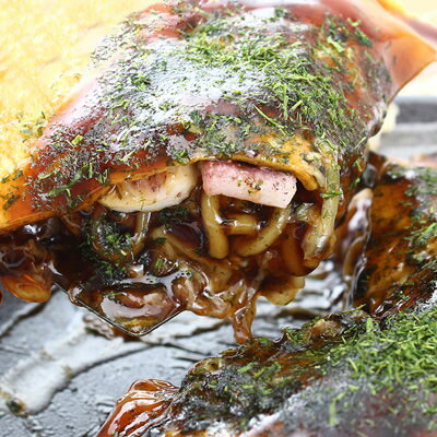 【アツアツふわふわのお好み焼とイカ天の食べ応えを一度に二つ味わえる贅沢!】現在の広島流お好み焼は半世紀以上前から続く「みっちゃん」のアイデアの集大成ともいえます。